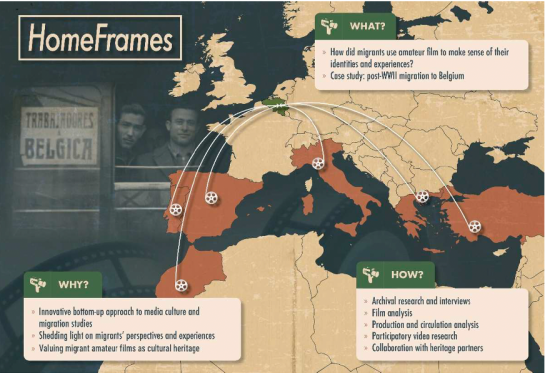 The HomeFrames research project introduces a pioneering approach to the study of film and migration by focusing on amateur films produced by migrants themselves, diverging from the traditional emphasis on professional feature films and documentaries. This innovative project seeks to investigate how migrants in post-war Belgium (1944-1974) used amateur film to reflect, construct and make sense of their migrant identities and experiences. The project aims to provide a mapping of amateur films made by migrants, to gain insight into the production and circulation practices of these films, to analyse their representational and stylistic features, and to evaluate their cultural heritage value. Ultimately, HomeFrames aims at a nuanced understanding of amateur film, migration and cultural diversity through the lens of home-making. Thereby, the project draws on and aims to contribute to three key fields of literature: media culture and migration, amateur filmmaking, and arts and migration. To achieve its objectives, the project employs a multi-methodological approach, integrating archival research, crowdsourcing, oral history interviews, film analysis and participatory